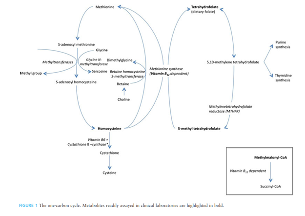 Folate, or vitamin B9, is a generic term for a water-soluble vitamin obtained from the diet that is involved in the transfer of methyl groups (i.e., single carbon-containing groups) in multiple biochemical metabolic pathways, including nucleic acid biosynthesis and methionine/homocysteine metabolism. Folate metabolism is closely linked to vitamin B12, cobalamin. Folate deficiency can be implicated in many disease states and processes; however, it is usually easily remedied with either a change in diet or a dietary supplement of the synthetic form, folic acid.1,2