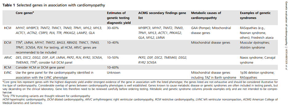 - Musunuru, K., Hershberger, R. E., Day, S. M., Klinedinst, N. J., Landstrom, A. P., Parikh, V. N., Prakash, S., Semsarian, C., & Sturm, A. C. (2020). Genetic Testing for Inherited Cardiovascular Diseases: A Scientific Statement From the American Heart Association. Circulation: Genomic and Precision Medicine, 13(4), e000067. https://doi.org/doi:10.1161/HCG.0000000000000067